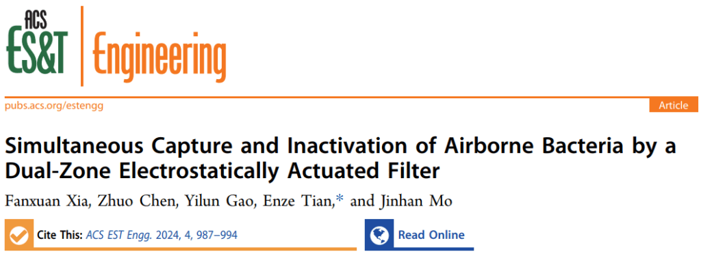 Xia, F., Chen, Z., Gao, Y., Tian, E., Mo, J. Simultaneous Capture and Inactivation of Airborne Bacteria by a Dual-Zone Electrostatically Actuated Filter. ACS ES&T Engineering, 2024, 4(4), 987-994.