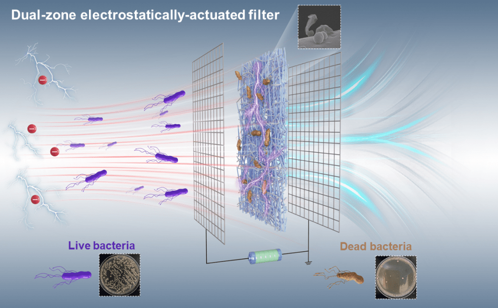 室内空气质量对人类健康至关重要,而生物气溶胶(如细菌、真菌和病毒)的传播已成为重大公共卫生挑战。尤其在新冠疫情后,生物气溶胶控制技术需求激增。传统纤维过滤器虽广泛用于暖通空调(HVAC)系统,但存在两大缺陷:一是高捕获效率往往伴随高风阻,增加风机能耗;二是被捕获的微生物可能在滤网上存活甚至繁殖,释放病原体或毒素造成二次污染。现有技术如紫外线杀菌、光催化氧化等虽能灭活细菌,但需额外设备且难以与通风系统集成。因此,开发一种能同步高效捕获、灭活细菌且维持超低风阻的技术,成为能源节约型通风系统的迫切需求。