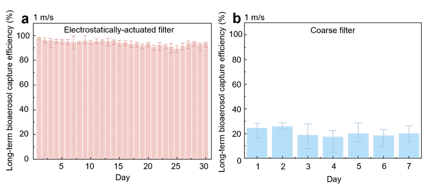 为验证实际应用潜力,团队进行了连续30天的持续测试。实验结果如图2所示,在每日运行13小时、风速1 m/s条件下,过滤器对大肠杆菌气溶胶的日均捕获效率达93.8%,波动幅度仅4.8%。对比普通粗效滤网(7天内效率跌至20.7%),静电驱动过滤展现出显著稳定性。30天后,效率仅微降至92.1%,且滤网可通过简单清洗或更换恢复性能。其低能耗特性(功耗0.18 W)与通风系统天然适配,为长期节能运行提供保障。
